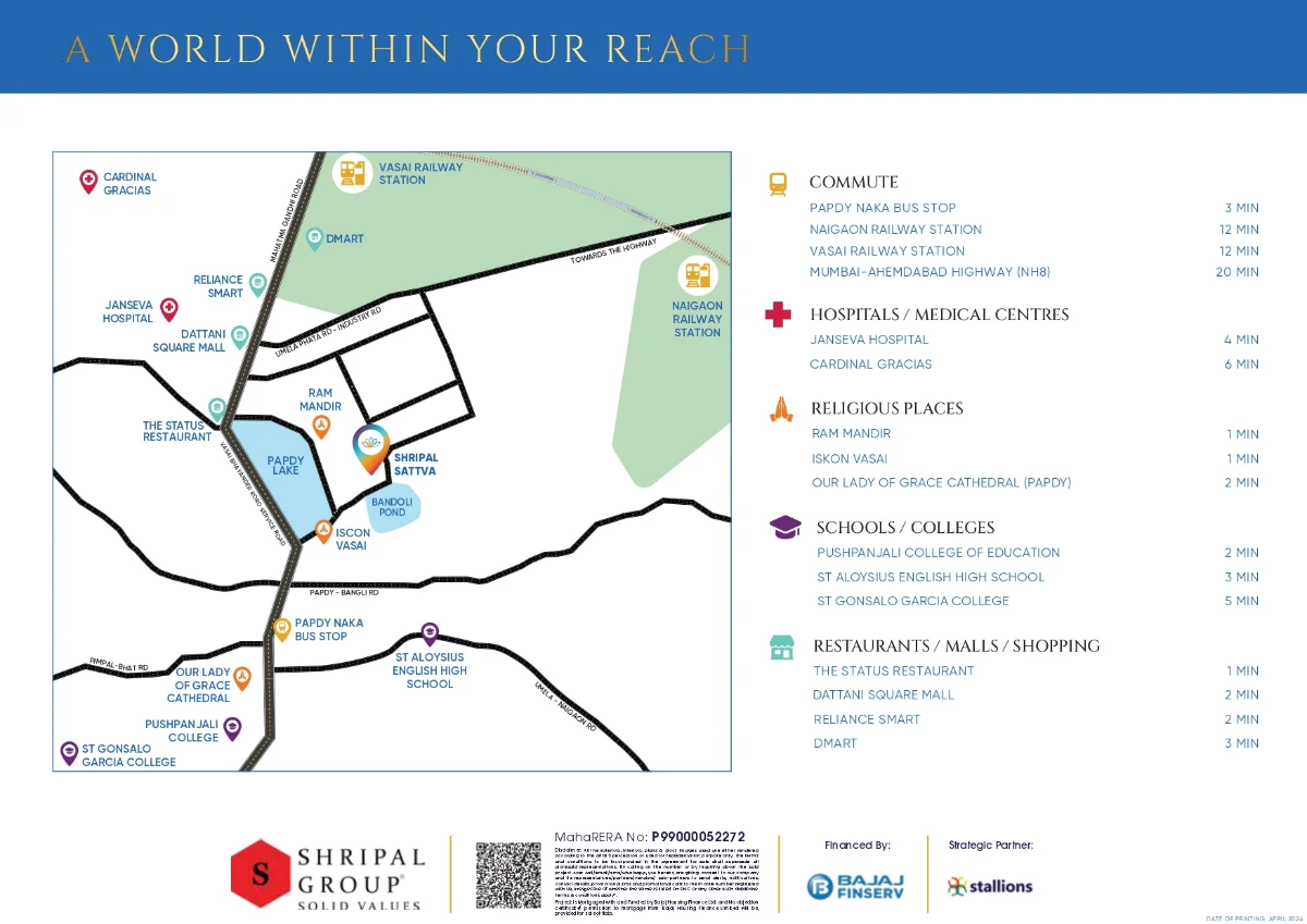 At Sattva, the world is truly within your reach. Nestled in a prime location, you’re just minutes away from essential amenities and vibrant city life. Enjoy easy access to transportation with Papdy Naka Bus Stop (3 min), Naigaon and Vasai Railway Stations (12 min each), and the Mumbai-Ahmedabad Highway (20 min). Healthcare is nearby with Janseva Hospital (4 min) and Cardinal Gracias Hospital (6 min). For spiritual needs, Ram Mandir, ISKCON Vasai, and Our Lady of Grace Cathedral are within a 2-minute radius. Education is prioritized with Pushpanjali College of Education, St. Aloysius English High School, and St. Gonsalo Garcia College all within 5 minutes. For your shopping and dining pleasure, Dattani Square Mall, Reliance Smart, DMart, and The Status Restaurant are just a stone’s throw away. Experience the perfect blend of urban convenience and serene living at Sattva.